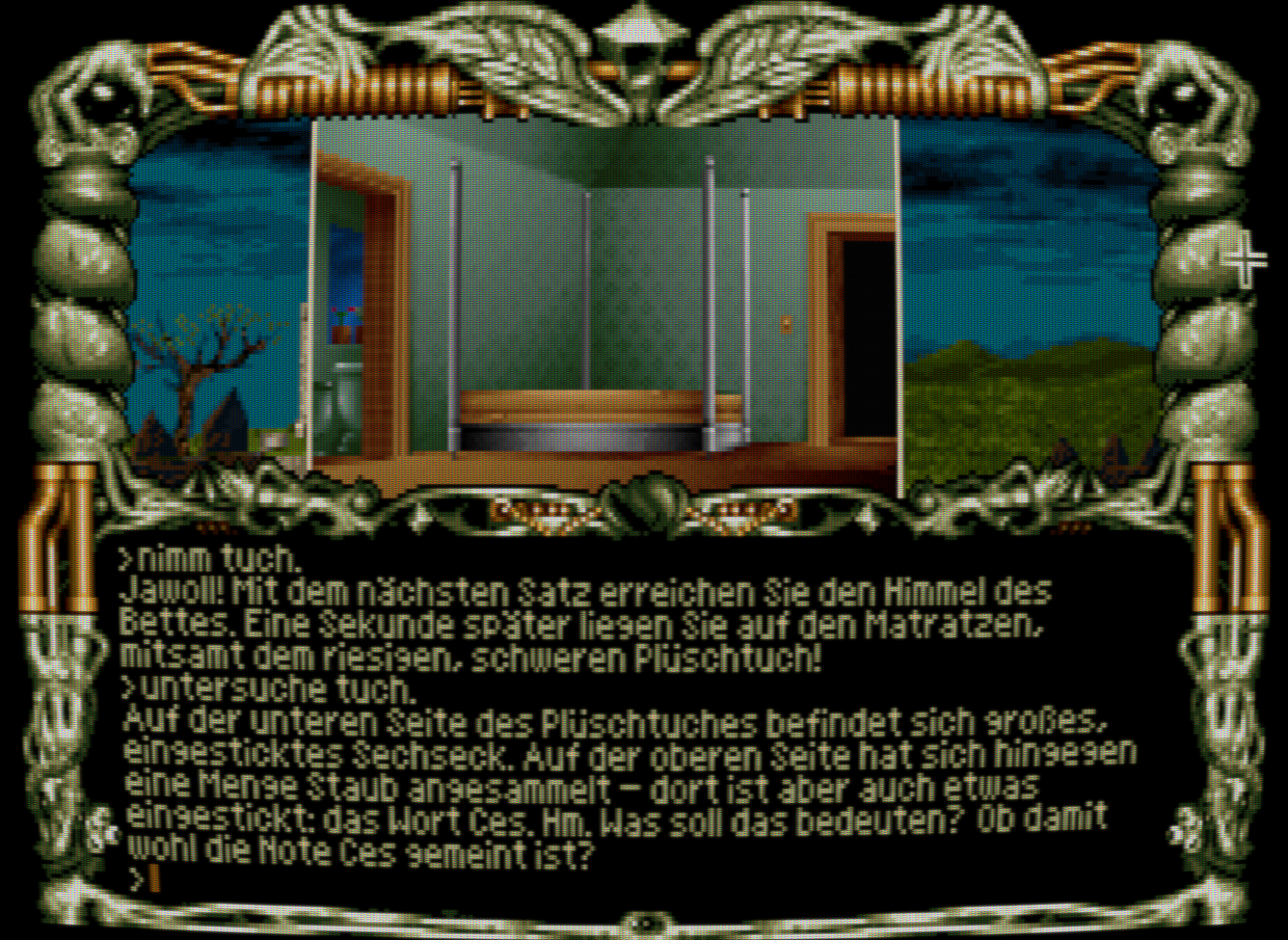 Frohen Mutes gehen wir mit unserem Enterhaken in den ersten Stock, um den Himmel des Himmelbetts zu angeln – geht leider nicht. Nach etwas probieren kommen wir auf die Idee auf das Bett zu steigen und zu hüpfen – was tatsächlich funktioniert. So bekommen wir den Himmel des Bettes zu fassen und finden den Text „Ces“ aufgestickt… toll…