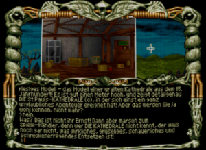 Wir kommen auf die Idee uns die depressive Decke einmal anzusehen – erst dann teilt uns das Spiel mit, dass dort eine Falltür zum Dachboden ist. Manche Infos hätte man uns auch früher geben könne… Mit dem Enterhaken allein kommt man nicht ran, aber wir können den Tisch aus der Küche durch die Gegen schieben und mit diesem kommen wir dann an die Falltür zum Dachboden. Dort finden wir im Westen in einer Schublade einen Würfelzucker, die interessanten Kisten auf dem Dachboden enthalten nur Werbung für andere Weltenschmiede-Spiele… seltsamer Humor…