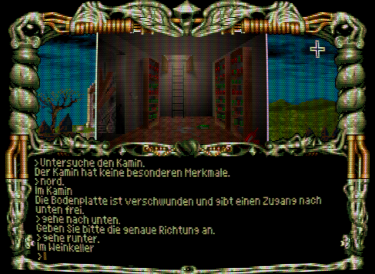 Das Licht der Kerze hilft uns, im Raum im Westen im Gerümpel den Haken einer Gartenhacke zu bekommen, den wir mit dem Schaft verbinden, um uns einen Enterhaken zu bauen. Mehr findet sich hier unten scheinbar nicht.